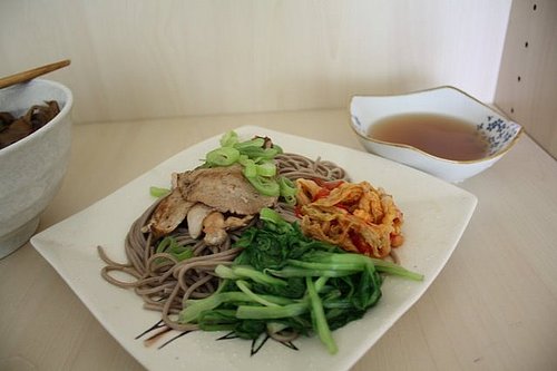1、清水煮沸,放进荞麦面,煮个几分钟(注:煮的时候会有泡沫浮起来,可以一边把泡沫舀掉,如果之间不浪费什么时间的话等舀完的时候差不多“几分钟”也到了= =);然后用冷水冲一冲(←健康考虑可以用冷开水),放在漏勺上把水滤掉,搁一边。